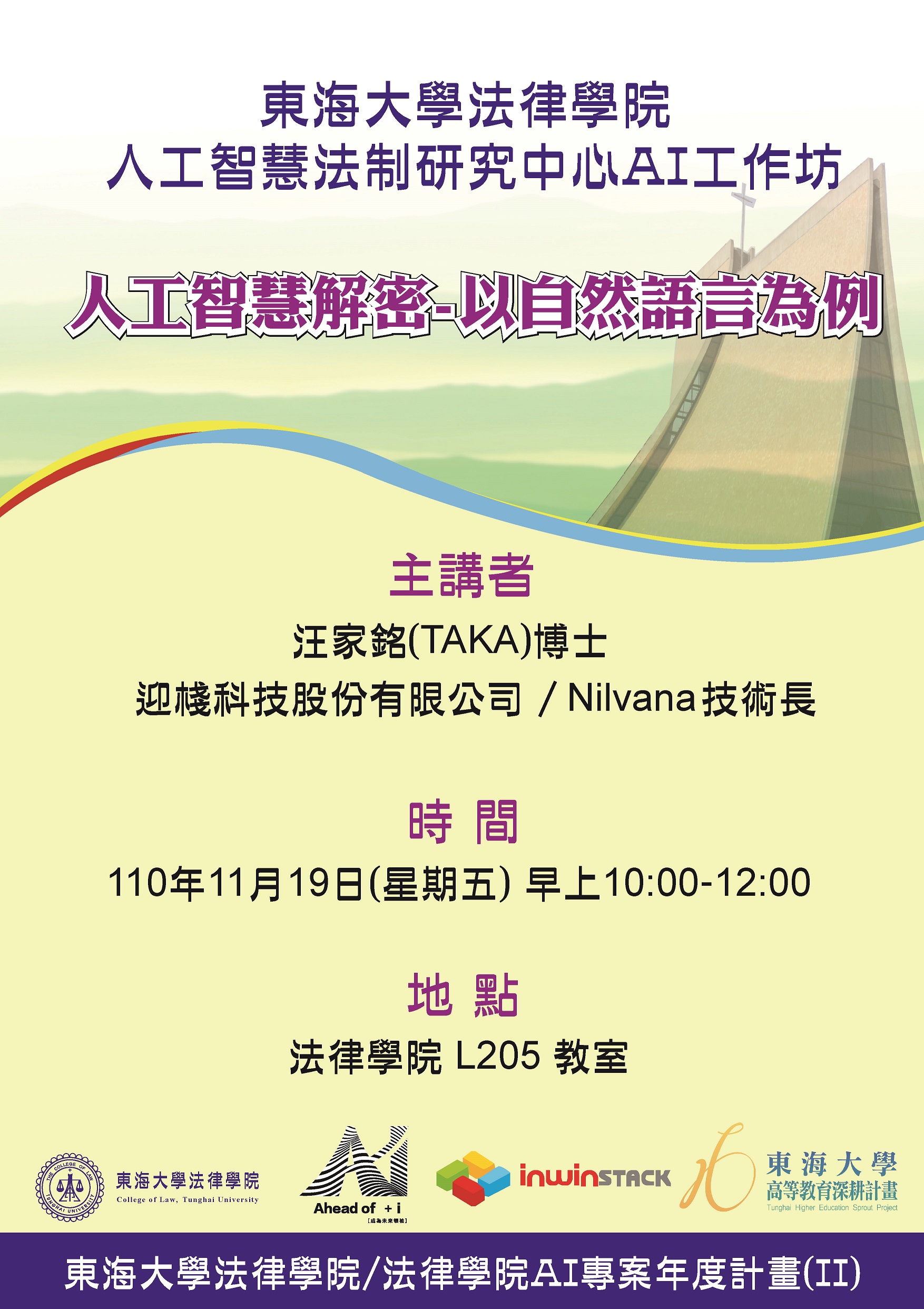 人工智慧解密--以自然語言為例2021/11/19(東海大學法律學院人工智慧法制研究中心AI工作坊)