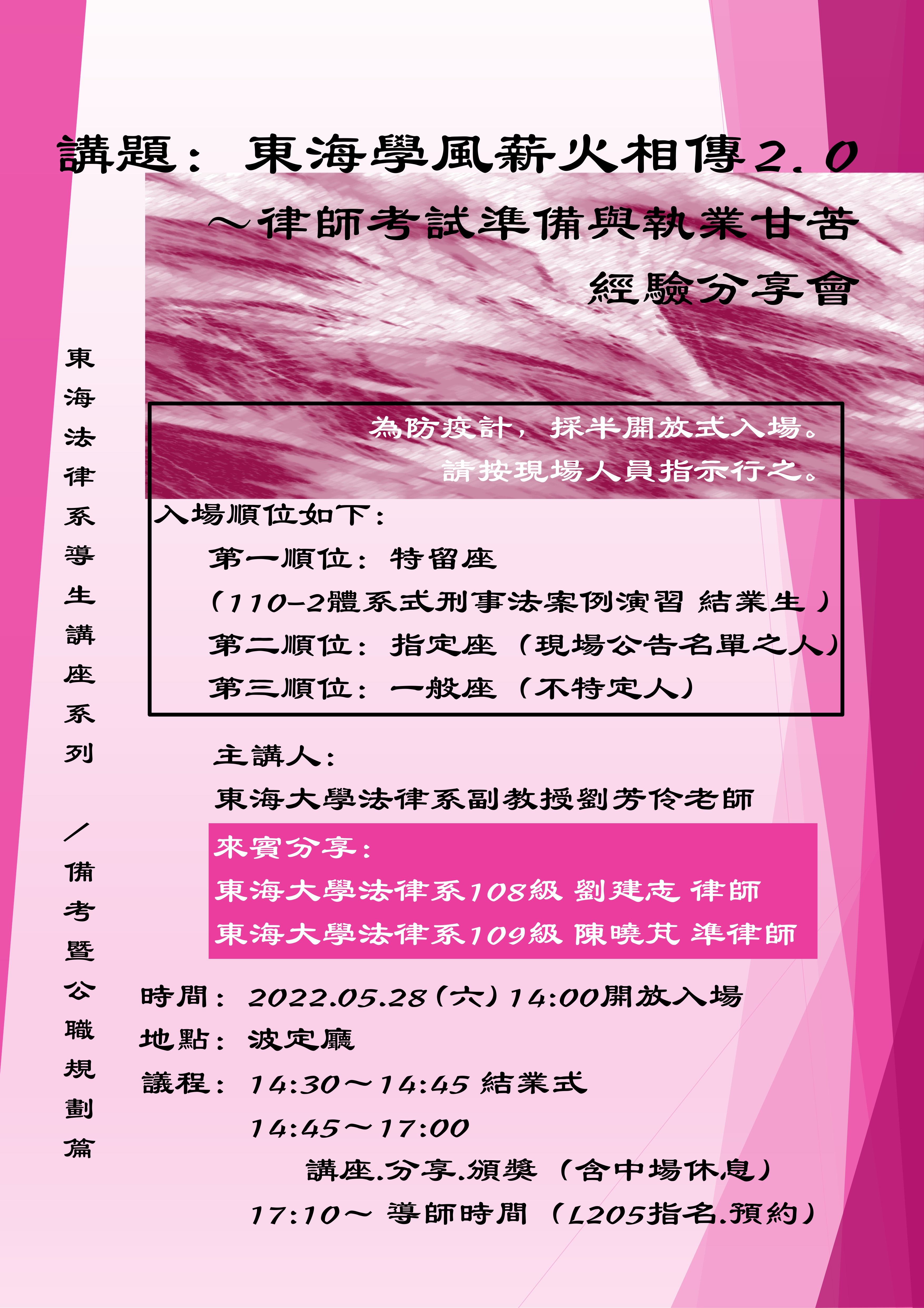 講題:東海學風薪火相傳2.0-律師考試準備與職業甘苦經驗分享會